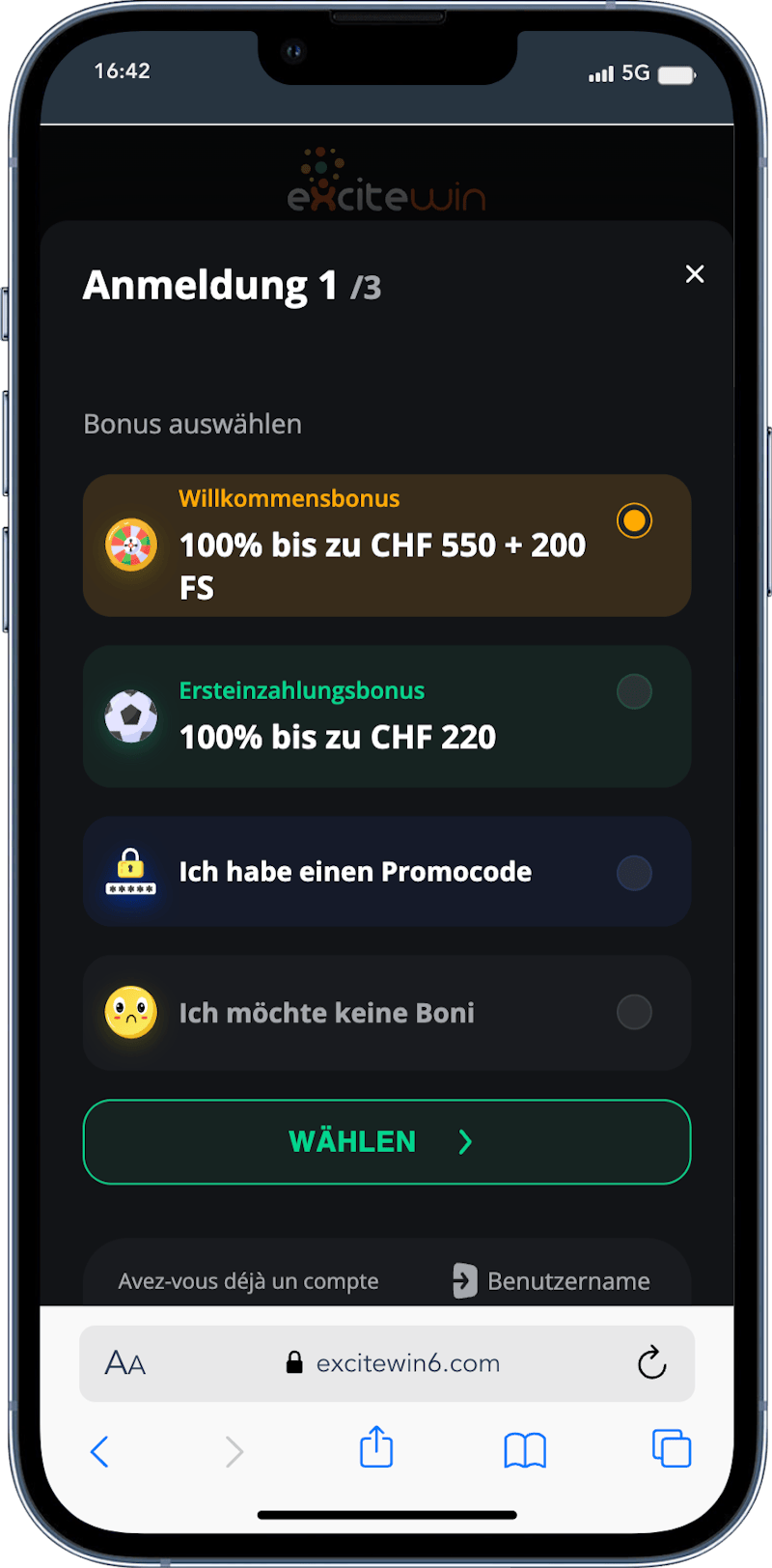 - Bestätige die AGB von Excitewin, drücke auf den Button „Wählen" und folge den weitere Anweisungen im Registrierungsprozess.